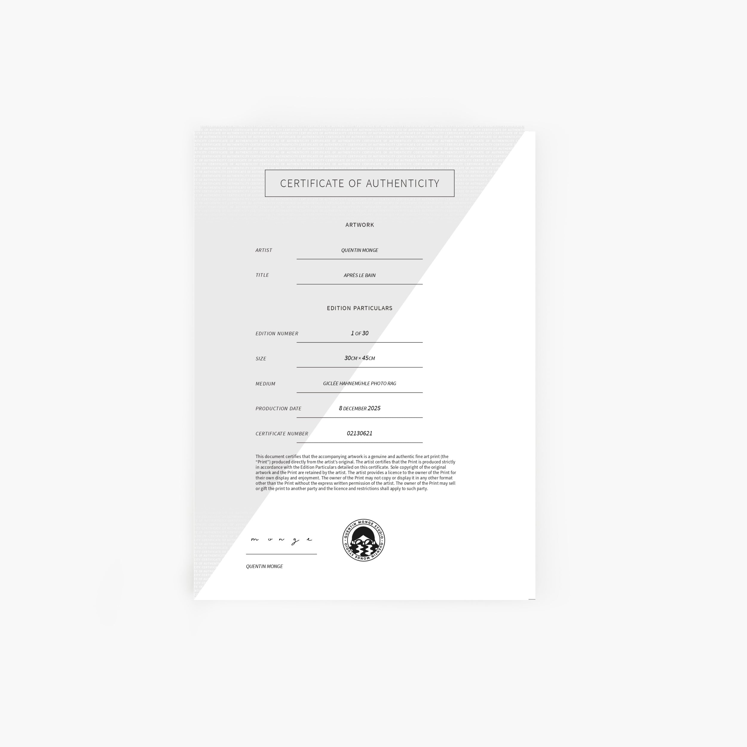 - Presented on acid-free, archival cotton Photo Rag Giclée paper from Hahnemühle
